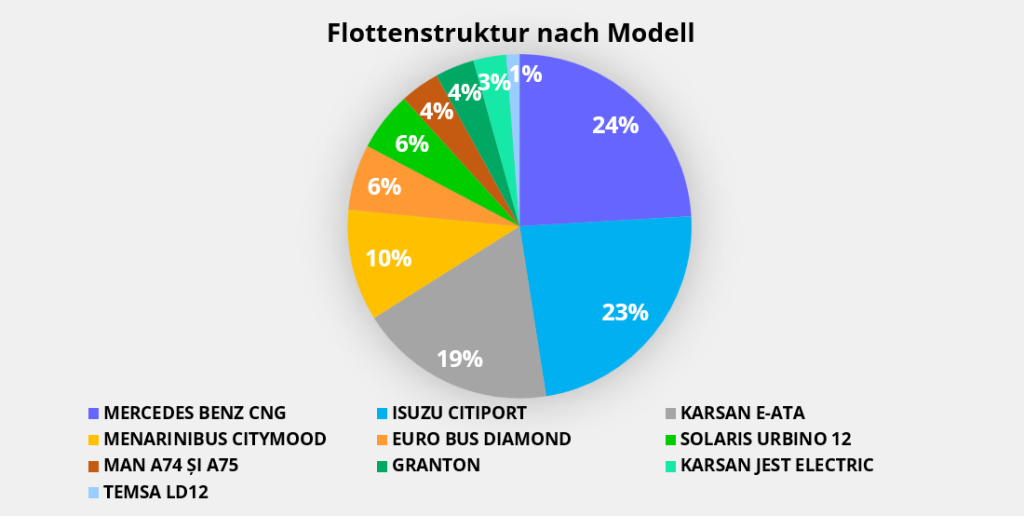Modell Anzahl der Busse Prozentsatz MERCEDES BENZ CNG 39 24% ISUZU CITIPORT 38 23% KARSAN E-ATA 30 19% MENARINIBUS CITYMOOD 17 10% EURO BUS DIAMOND 10 6% SOLARIS URBINO 12 9 6% MAN A74 ȘI A75 6 4% GRANTON 6 4% KARSAN JEST ELECTRIC 5 3% TEMSA LD12 2 1%